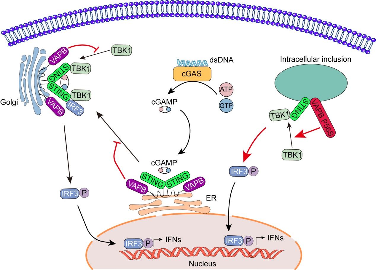 Đột biến VAPB P56S gây ra bệnh xơ cứng teo cơ một bên (ALS) Đường dẫn tín hiệu cGAS-STING đóng vai trò quan trọng trong sự xuất hiện và phát triển của ALS Nghiên cứu này khám phá thêm tác dụng điều chỉnh của VAPB P56S trên đường truyền tín hiệu cGAS-STING Đột biến VAPB P56S sẽ dẫn đến những thay đổi về vị trí nội bào và sự kết tụ bất thường của nó Nghiên cứu cho thấy VAPB P56S được tổng hợp bất thường có thể huy động STING, từ đó thúc đẩy quá trình tổng hợp STING và huy động TBK1 ở trạng thái nghỉ, và cuối cùng thúc đẩy sự biểu hiện của interferon loại I qua trung gian STING